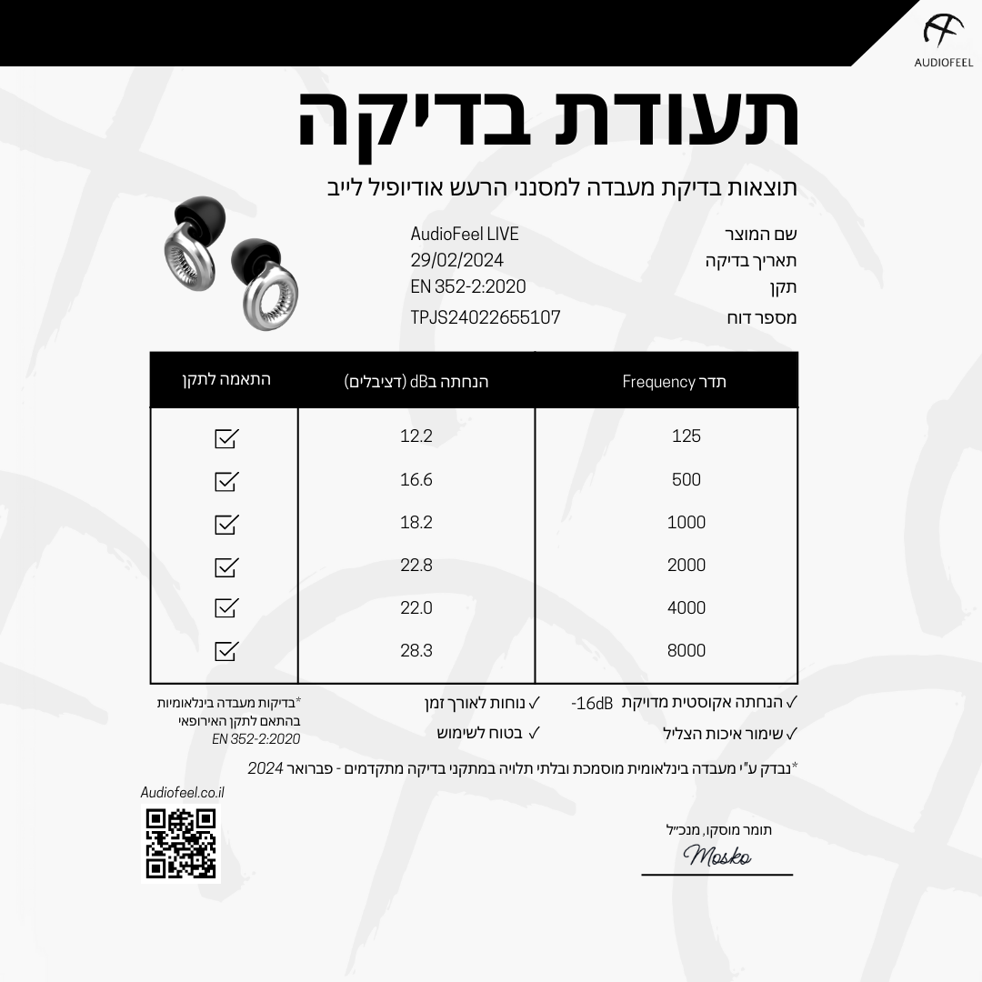 המסננים שלנו מספקים הנחתה אקוסטית מדויקת של -16dB, שומרים על איכות הצליל ומאפשרים חוויית מוזיקה מלאה ללא פגיעה בשמיעה.